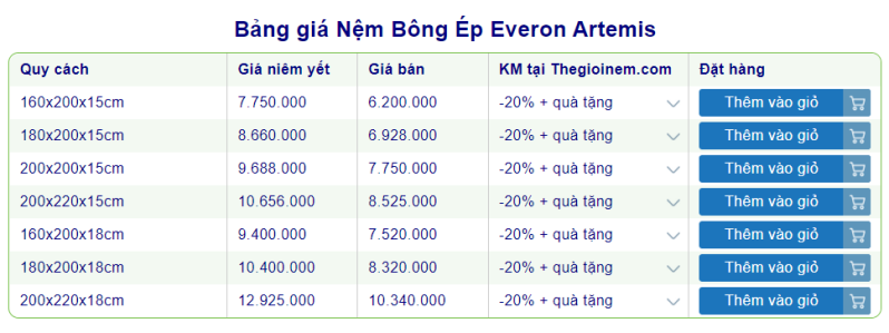 Một sản phẩm có chất lượng tốt và nhiều mẫu mã như nệm bông ép Everon thường sẽ có mức giá cao. Nhưng trên thực tế, nệm có giá thành phù hợp với nhiều đối tượng từ những gia đình có kinh tế khó khăn cho tới sinh viên. Nếu mua nệm trong các chương trình ưu đãi thì sẽ có mức giá tốt hơn.