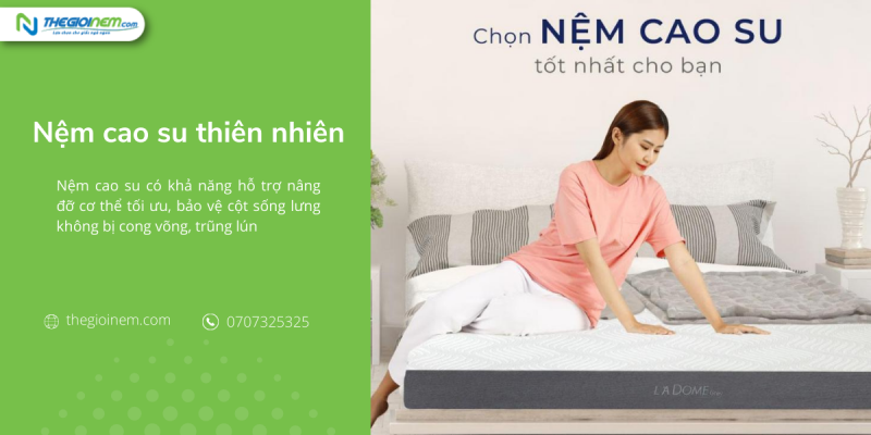 Chất liệu cao su thiên nhiên có nhiều đặc tính nổi bật, khi được ứng dụng công nghệ hiện đại còn có khả năng kháng khuẩn, kháng cháy. Vì thế nệm cao su thiên nhiên thường có giá cao hơn so với các chất liệu cao su tổng hợp, cao su nhân tạo hay bông ép. Hiện nay có nhiều thương hiệu nệm cao su được tin dùng như Kymdan, Dunlopillo, Kim Cương, Vạn Thành, Liên Á, Tatana, Đồng Phú.